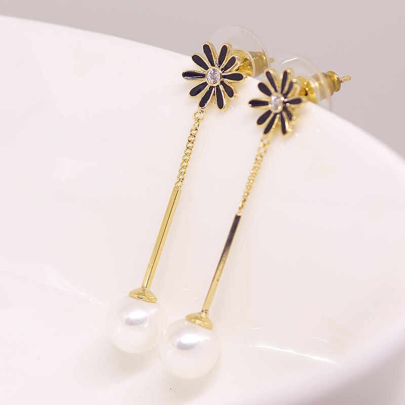 18K RGP ゴールド ダイヤ CZ ブラック フラワー パール ロング 揺れ ピアス gp5262
