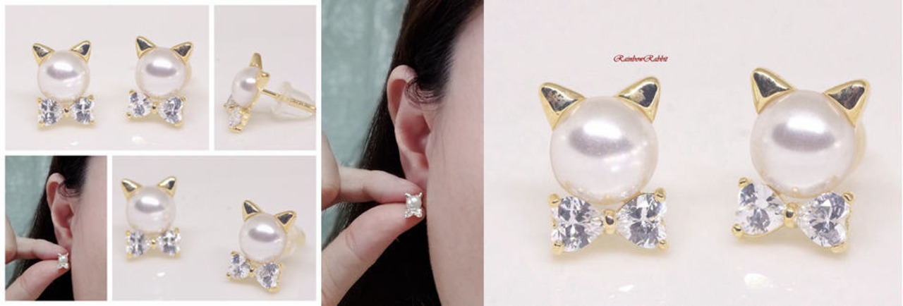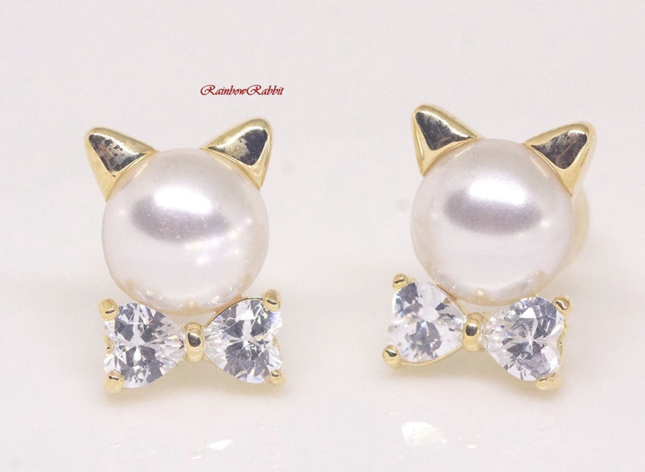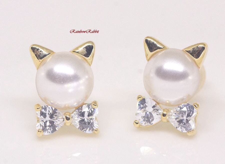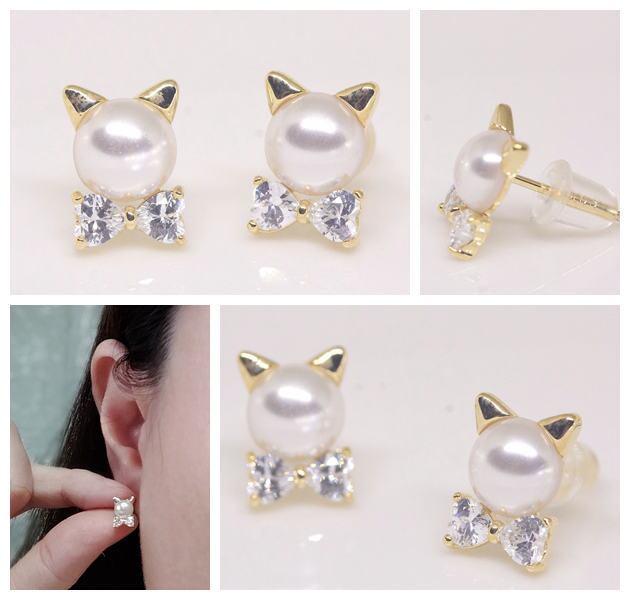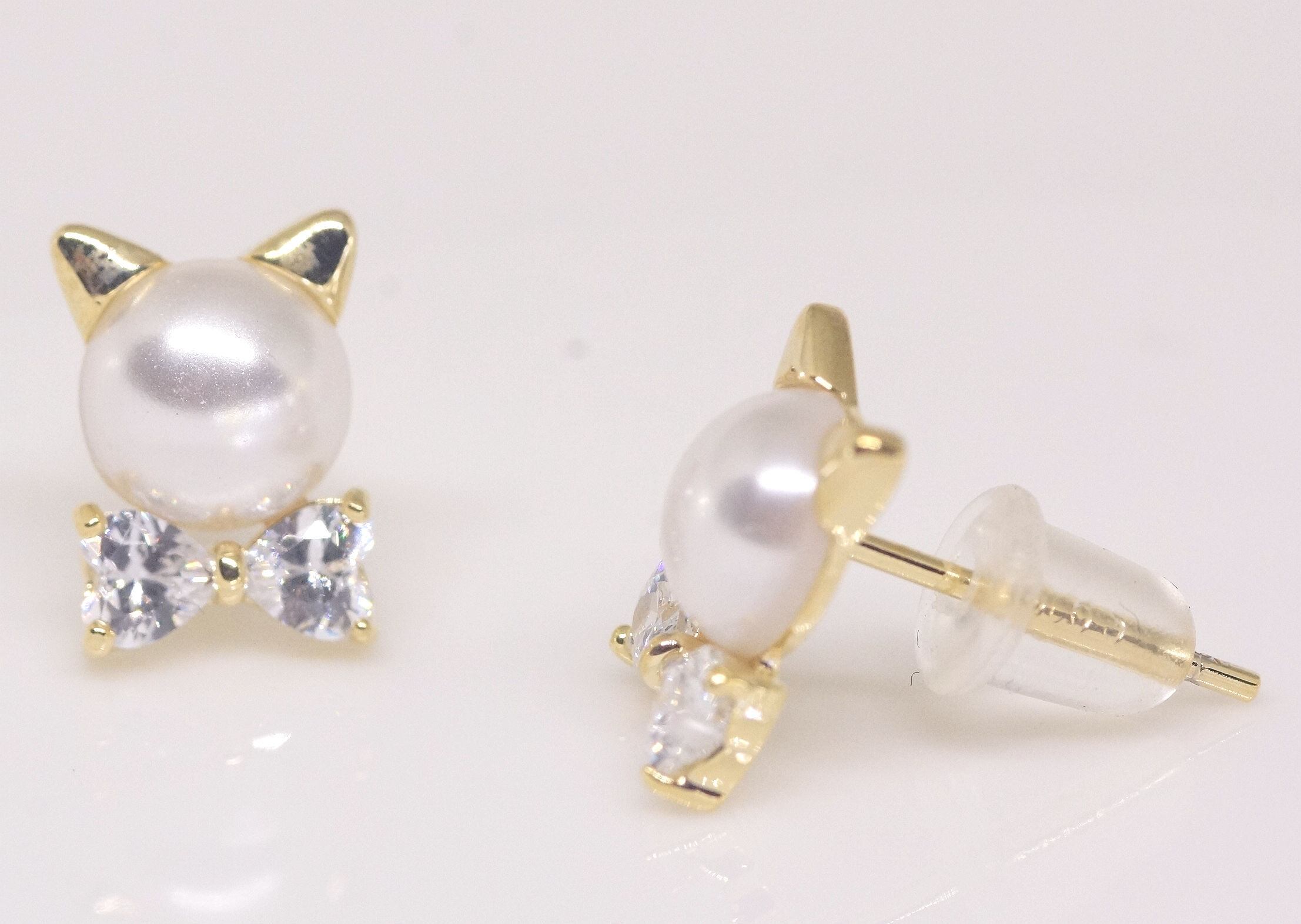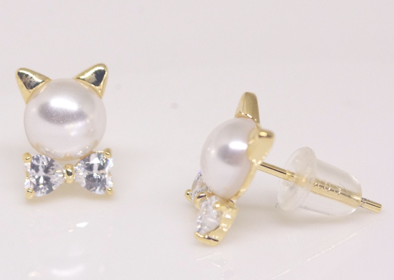 18K RGP ゴールド ダイヤ CZ キュート 猫 パール ピアス gp5386