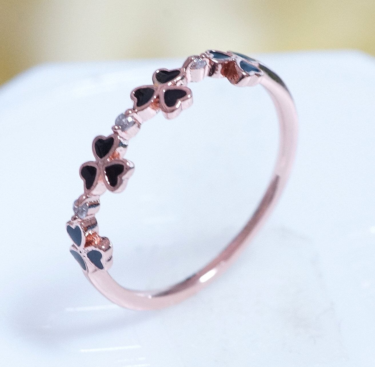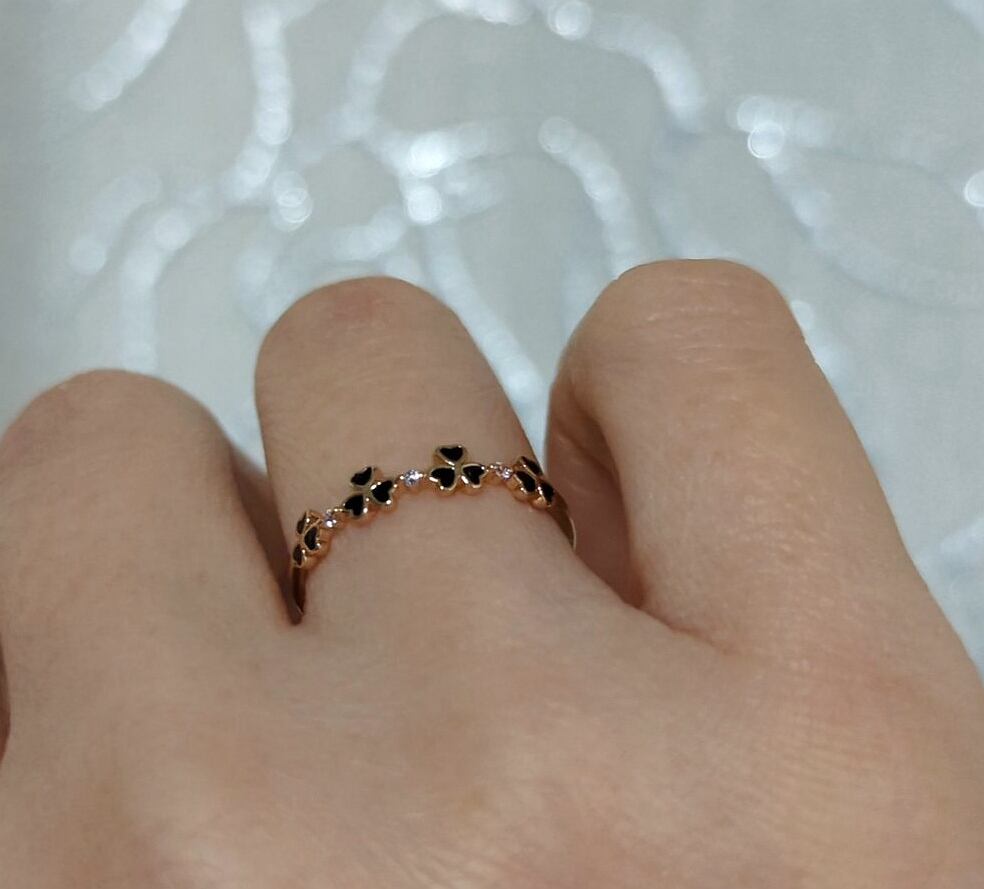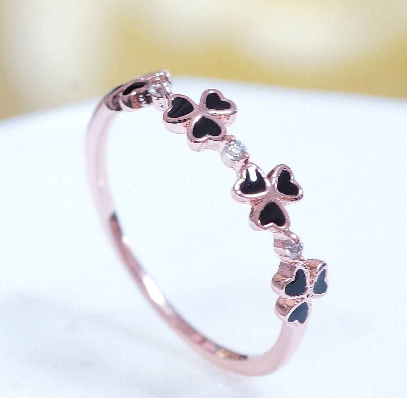 18K RGP ゴールド ダイヤ CZ 三つ葉 ブラック フラワー リング gu1261e