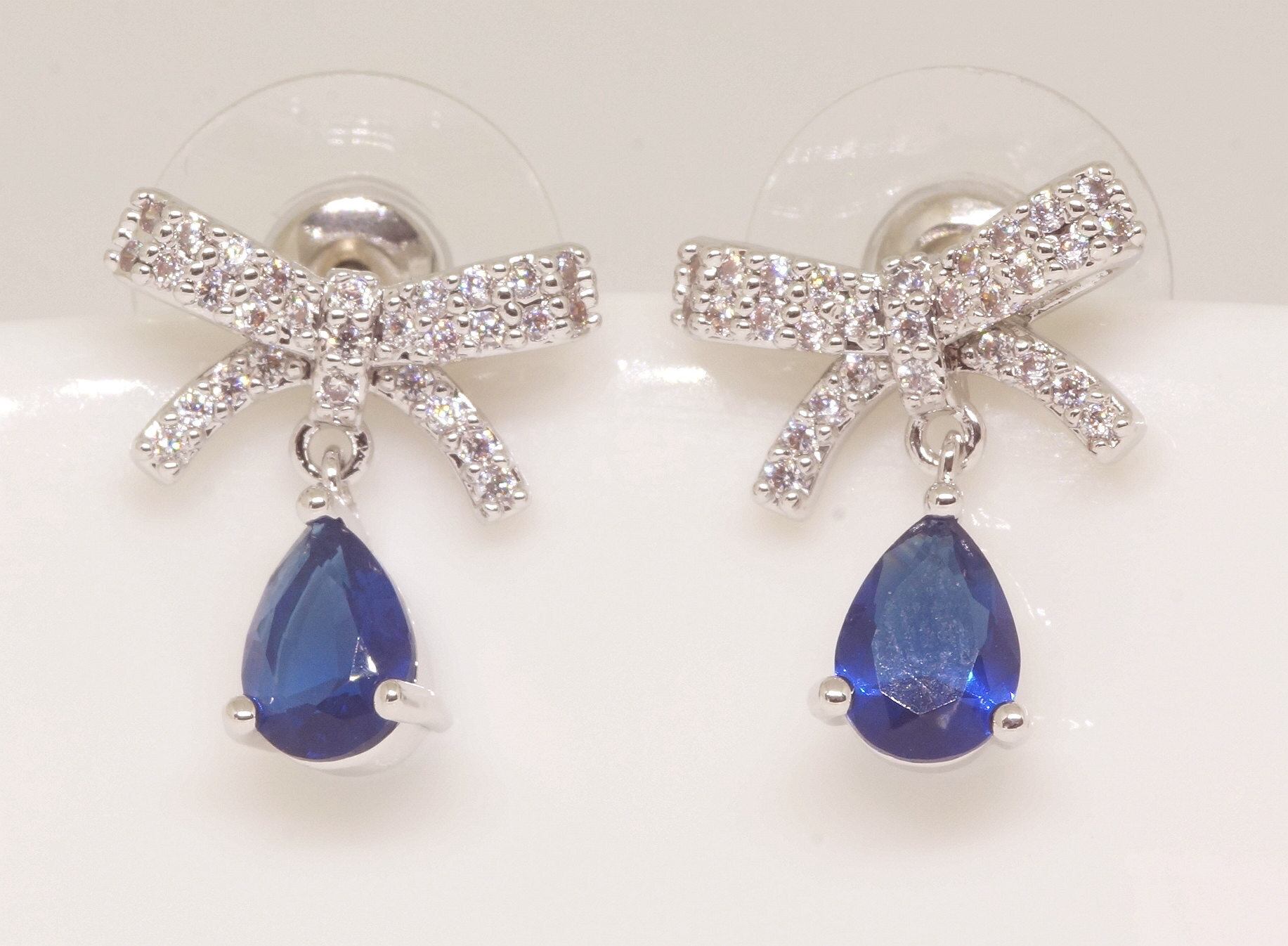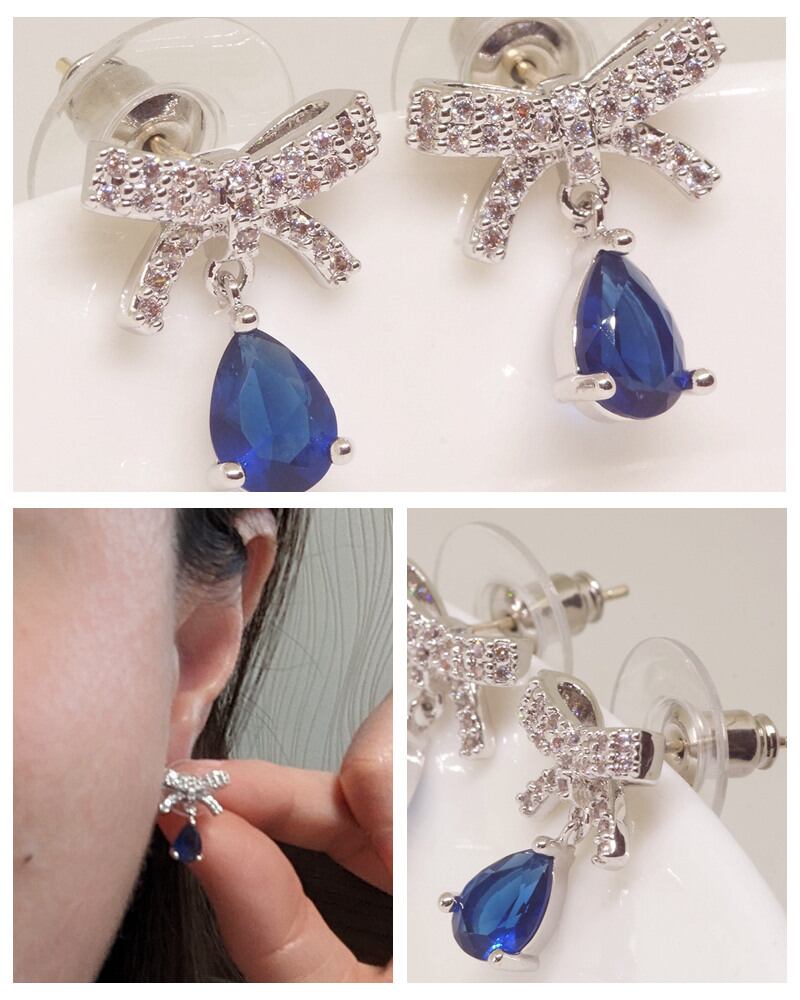 18K RGP プラチナ ダイヤ CZ リボン ブルー 雫 ピアス yp4908