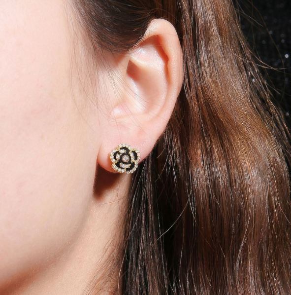 18K RGP ゴールド ダイヤ CZ ブラック バラ ピアス gp5690
