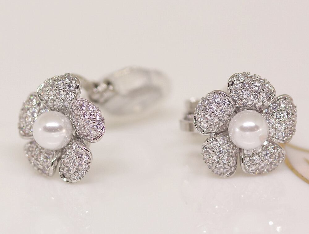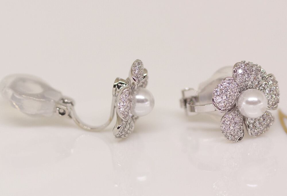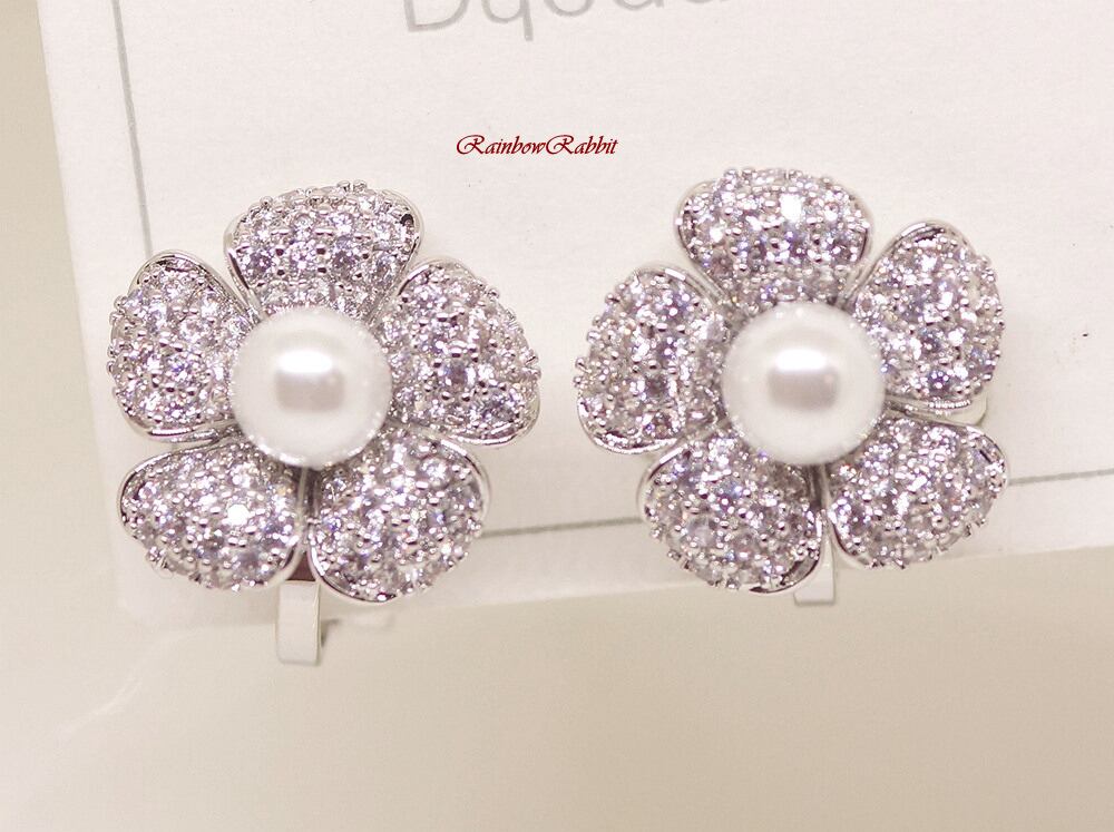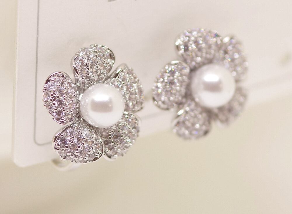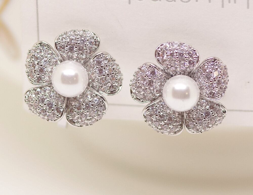 18K RGP プラチナ ダイヤ CZ フラワー パールイヤリング yp5018