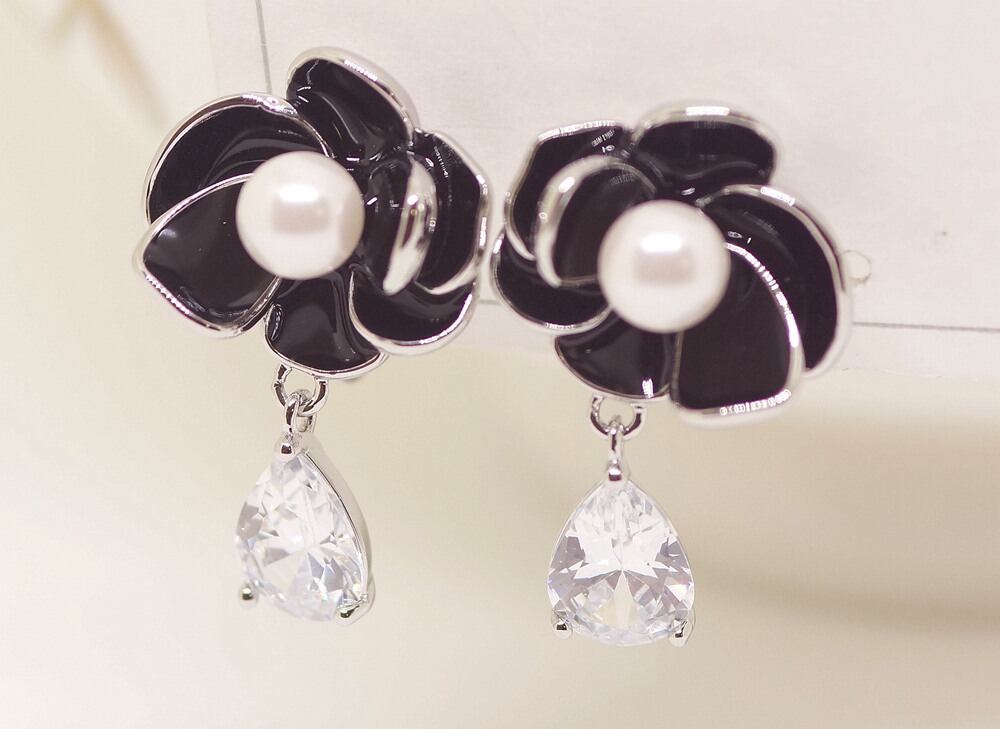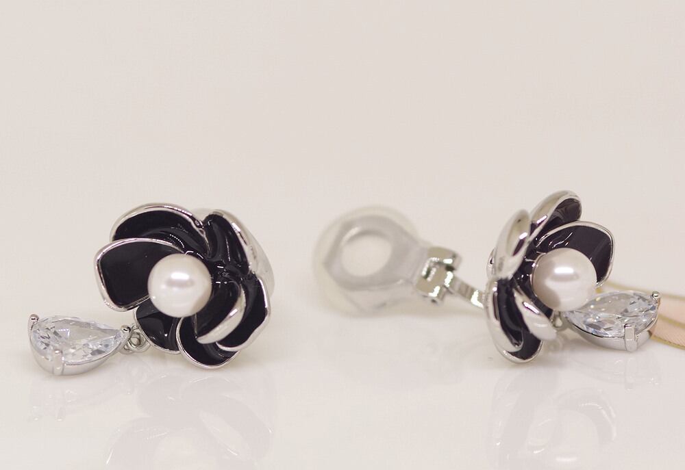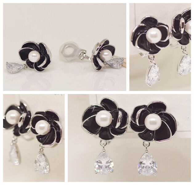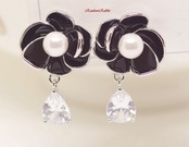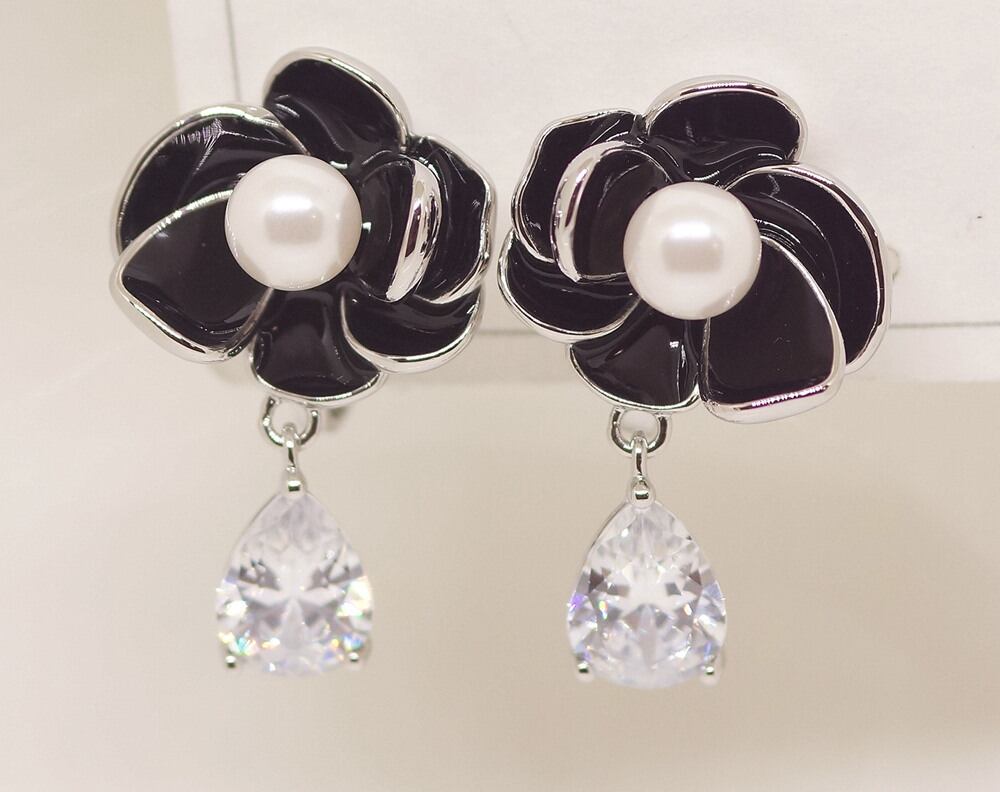 18K RGP プラチナ ダイヤ CZ 黒バラ パール 雫 イヤリング yp5007